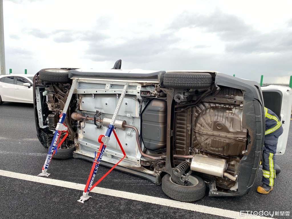 國道警方7日上午9時29分接獲民眾報案,在國道五號南下路段34.6公里處有1白色自小客車突翻覆,車體向右側翻後瞬間成90度倒立在外側車道上。據了解,該車輛內僅有駕駛及1名台中66歲張姓女乘客,而因車體右側遭壓的關係,坐在副駕駛座的張女因行動不便受困車內,警消到場以器材破壞車輛後,目前已將她送往宜蘭陽民大學附設醫院救治。至於詳細事故發生原因仍有待進一步調查釐清。