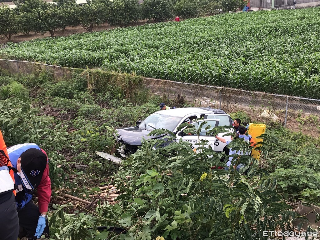 ▲台中警國道自撞,警車翻落邊坡。(圖/記者林悅翻攝)