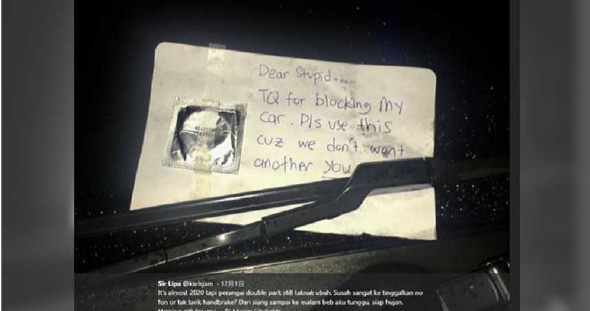 男子最後失去耐心,寫下一張紙條及附上一個「保險套」夾在該車擋風玻璃雨刷,紙條上寫道「親愛的,謝謝你堵住我的車。請用這個,因為我們不想要再有另一個你。」