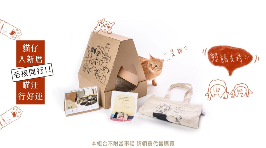 而「貓仔入新厝」的內容物,除了與「喵汪行好運」一樣擁有悠遊卡、帆布袋、桌曆之外,還多了「總統貓邸」,原來是經過特殊設計的紙箱禮盒,可以拼裝成屋頂,底部襯墊加厚貓抓板。蔡英文總統連任募款小物網站內容寫道,「簡單組合後,禮盒搖身一變成為舒適貓屋!本貓屋通過7公斤巨貓測試,空間寬敞,主子絕不委屈。」