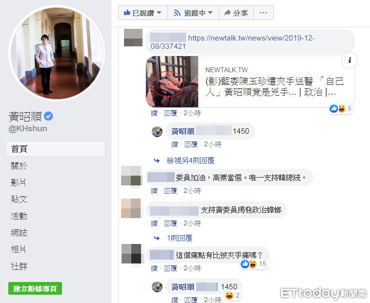 國民黨籍立委陳玉珍6日在外交部抗議過程中遭門夾傷,送至台大醫院急診室,然而卻被民進黨籍立委王定宇質疑,陳玉珍的手會被夾,是因為國民黨籍立委黃昭順所害。針對是否為害陳玉珍夾傷手的人?黃昭順至9日仍未正面回覆,但她的個人帳號卻疑似在臉書粉專上回應網友留言。