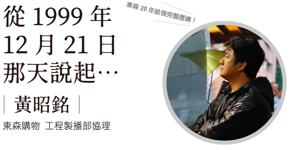 我在1999年10月加入東森購物擔任導播一職。當時東森購物正在做頻道直播銷售的準備,預計12月21日首次直播,並且由我執行第一檔的直播。雖然之前已經on過2年多的直播節目,但購物節目直播還是第一次嘗試。東森購物當時是台灣第一家電視購物頻道,又是台灣購物史上第一個直播銷售頻道,直播當下會有哪些突發狀況,並不清楚。開台前,大家都非常緊張,只能努力的每天彩排,來確保第一場直播節目的順利完成。