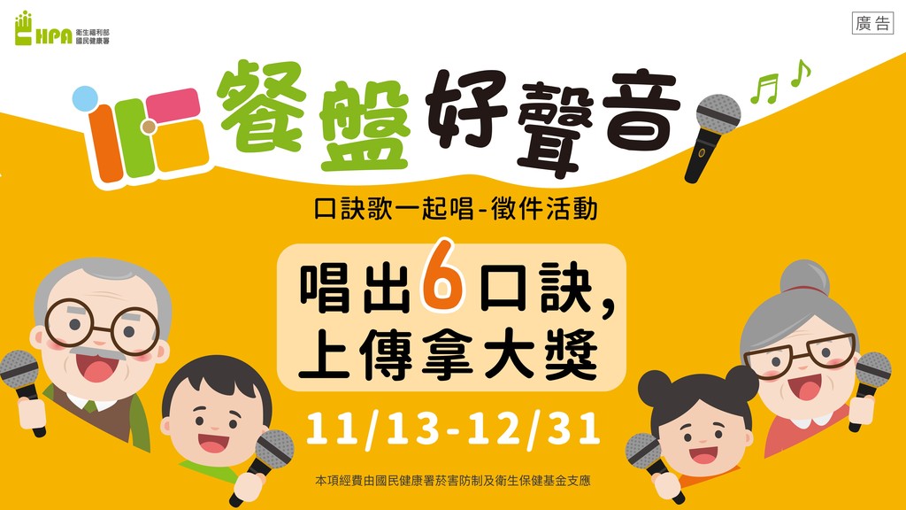 台灣人愛唱歌,小孩、大人假日聚會約去KTV飆歌,銀髮族搭車出遊,在車上卡拉OK整路唱不停,很多愛唱歌的人擠破頭想參加大型唱歌選秀節目,像是第二季比賽剛結束不久的「聲林之王」,不過選秀節目有年齡限制,需要經過海選和層層關卡,才有機會站在鏡頭前唱歌給大家聽,現在國民健康署舉辦「餐盤好聲音-口訣歌一起唱」徵件活動,只需要錄製一段口訣歌曲的歌唱影片,上傳到fb活動頁面,就有機會讓更多人聽見自己的歌聲,還有獎金、禮券可以拿,有網友分享自己才聽過「餐盤口訣歌」一遍,就被洗腦成功,不自覺會跟著唱了。