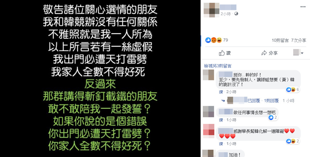 另外,針對外界質疑韓國瑜競選辦公室自導自演,黃征輝強調,「我和韓競辦沒有任何關係,不雅照就是我一人所為,以上所言若有一絲虛假,我出門必遭天打雷劈!我家人全數不得好死!」