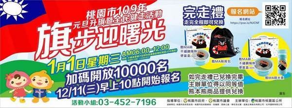桃園區元旦升旗健走活動,加碼的1萬名於11日上午10點起可透過ACCUPASS及活動咖線上報名。區公所說,如果沒報到名的民眾,可在元旦當天起個大早,6點也開放現場報名、限額2千人,完成報名和3公里健走,一樣可獲得熊本熊便當盒及背包,並參加抽獎,有Gogoro電動機車、iPad Air、iPhone、50吋液晶電視等豐富摸彩禮。