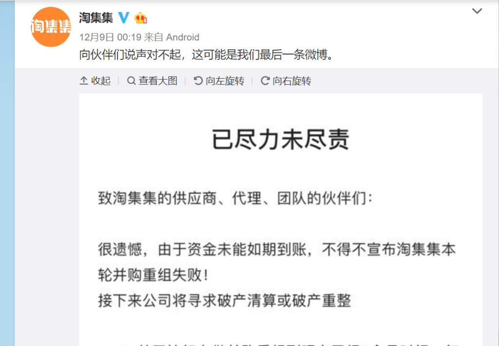 大陸電商平台競爭激烈,擁有1.3億用戶的「淘集集」在微博上出聲明,「向夥伴們說聲對不起,這可能是我們最後一條微博」,由於資金未能如期到帳,併購重組失敗,將尋求破產清算或破產重整,前後只營運了1年多就黯然收場。