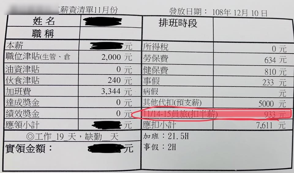 女網友10日在臉書「爆廢公社公開版」貼出自己上個月的薪資單,她指出,11月14日和15日(週四、週五)是員工旅遊,她也去參加了,沒想到卻被公司扣了半薪(933元),讓她相當疑惑,質疑根本就不符合勞工局的規定。