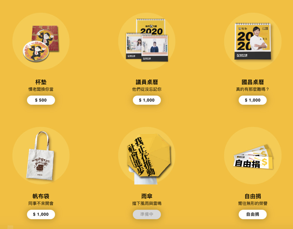 ▲時代力量推出2020大選募款小物。(圖/取自時代力量2020競選官網)