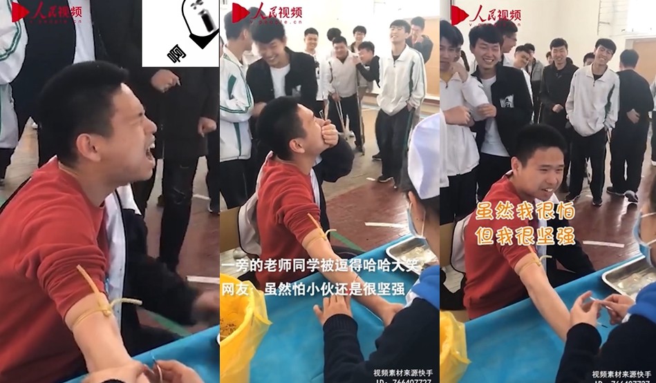 ▲高三生因為害怕針頭,他抽血時浮誇的表情,笑翻一票網友。(圖/翻攝人民視頻截圖,下同)