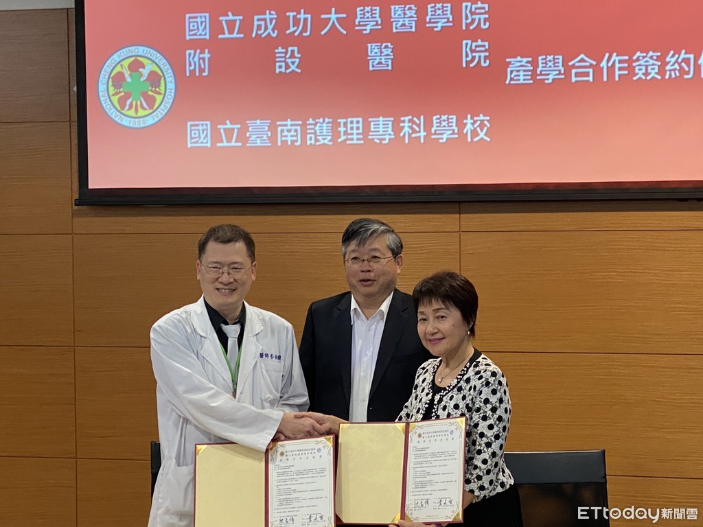 ▲合作協議在國立成功大學張俊彥副校長見證下,由成大醫院李經維副院長代表沈孟儒院長,與台南護專黃美智校長共同主持簽約儀式。(圖/記者林悅攝,下同)