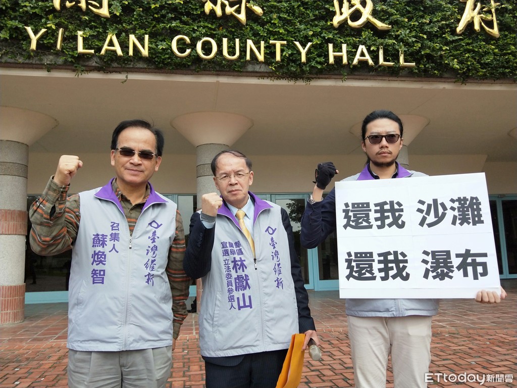 宜蘭頭城外澳海灘及金盈谷瀑布,原都屬公共財,為何變成小白宮榮梓博物館的私人沙灘自家庭園及金盈谷瀑布變成收費的渡假遊樂區?宜蘭立委候選人林獻山,12日向宜蘭縣政府陳情「還我沙灘、還我瀑布」,縣府派計畫處長李新泰接下陳情書。