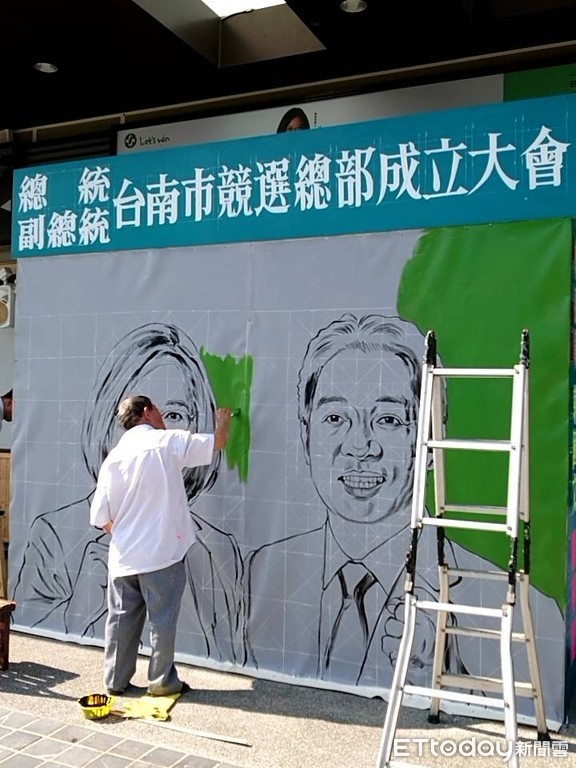 搬著階梯、提著漆桶爬上爬下,國寶級電影看板師顏振發老師,主動向蔡英文台南競總請纓,願意為蔡英文、賴清德兩位總統、副總統候選人繪製競選總部成立大會廣告看板,要用50年繪製電影看板的經驗,為蔡英文台南競總打造城市新亮點。