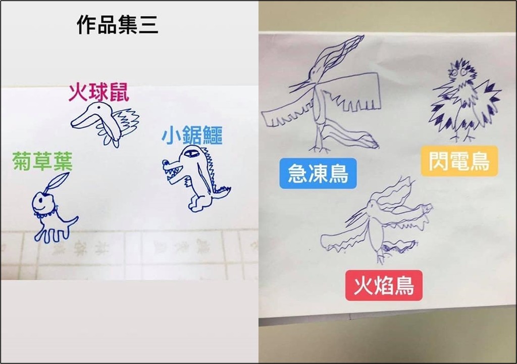 照片分享後立刻引發網友熱烈討論,有人說「醜到莫名可愛唉」、「特徵都有畫出來不錯了」、「閃電鳥超喜感,我彷彿看到了小雞吃米圖」、「真的是用靈魂在畫」、「INE貼圖快投稿 我一定買」、「那個小巨鱷是吸大麻了吧」、「靈魂畫風就是關鍵的地方像,其它都不像。」