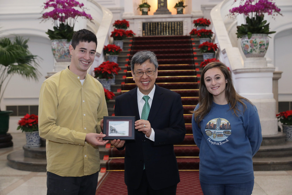 由中華文化總會與觀光局舉辦的「來去總統府住一晚」體驗活動進入倒數,12日文化總會副會長陳建仁副總統接見第9組外國朋友,來自加拿大的Lukas與Sabrina,他們曾旅居台灣2年、用美食環遊世界,累計拍攝影片超過200支,總瀏覽突破1.1億次!除了狂熱台灣美食,更稱讚台灣「令人感覺舒服與自在,同時帶著家的味道,彷彿能包容所有的人。」