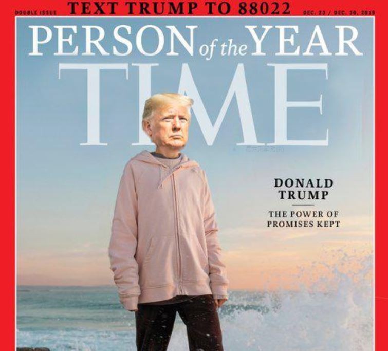 與此同時,川普的競選連任團隊竟然異開天開,把《時代雜誌》封面「年度風雲人物」桑柏格的照片,P上了川普的腦袋!。推特裡的解說文字說:「談到信守承諾,今年只有一個年度人物。」同時還列舉了川普的政績:包括經濟蓬勃發展、創造就業機會破紀錄、歷史性減稅、建立邊境牆、殲滅「伊斯蘭國」等。