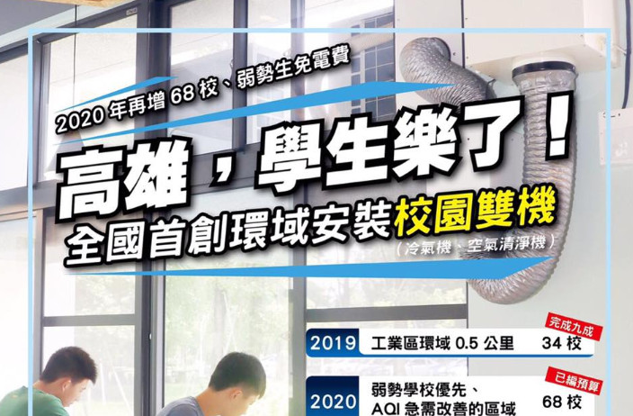 韓國瑜表示,「高雄,學生樂了,書要讀,身體嘛愛顧!」,全國首創環域安裝冷氣機、空氣清淨機,今年完成鄰近工業區34校裝設。