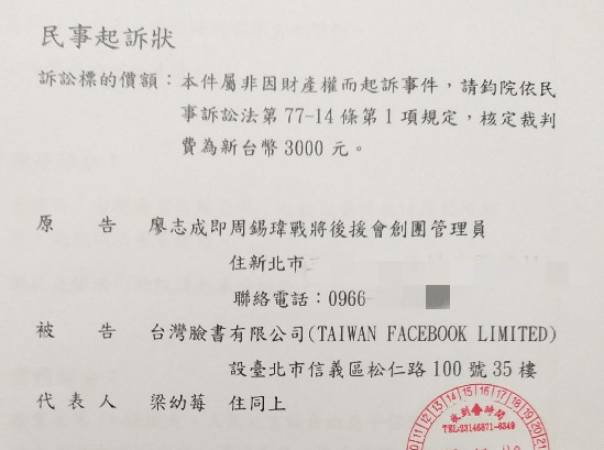 ▲韓國瑜後援會社團管理員廖志成怒告台灣臉書。(圖/廖志成提供)