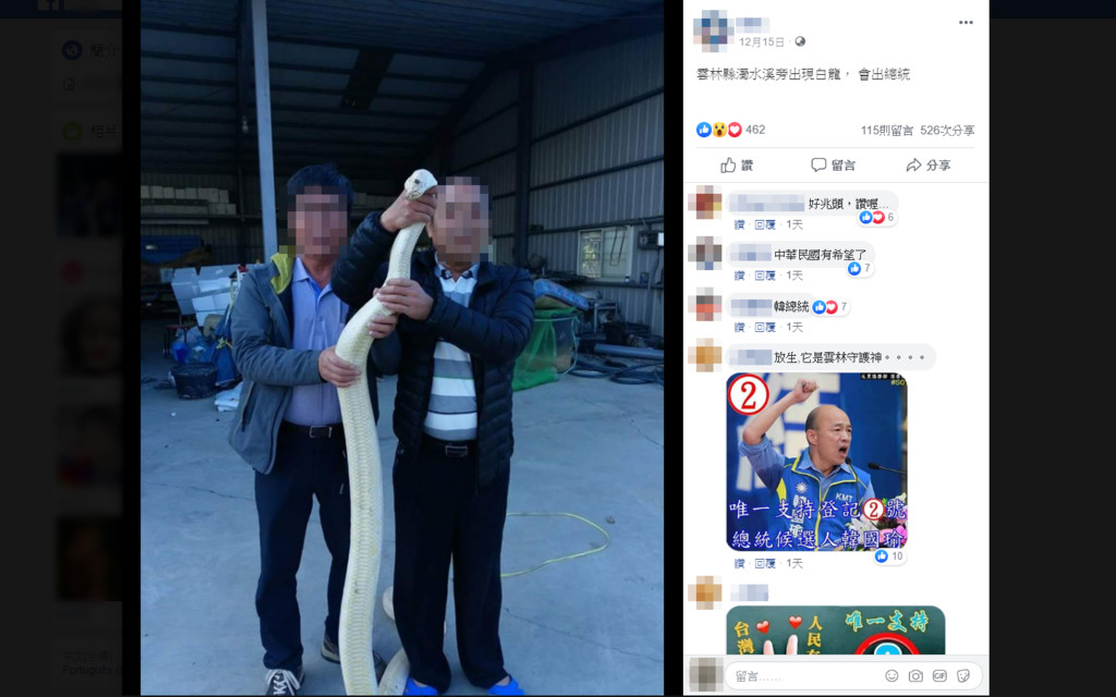 一名網友在臉書發文表示,雲林縣濁水溪旁捕獲一條大白蛇,象徵該地會出總統。許多韓粉看完照片紛紛大讚「好兆頭」、「眼睛看起來很有靈性」、「中華民國有希望了」、「一切天意,唯一支持韓國瑜進入總統府」,掀起熱議。