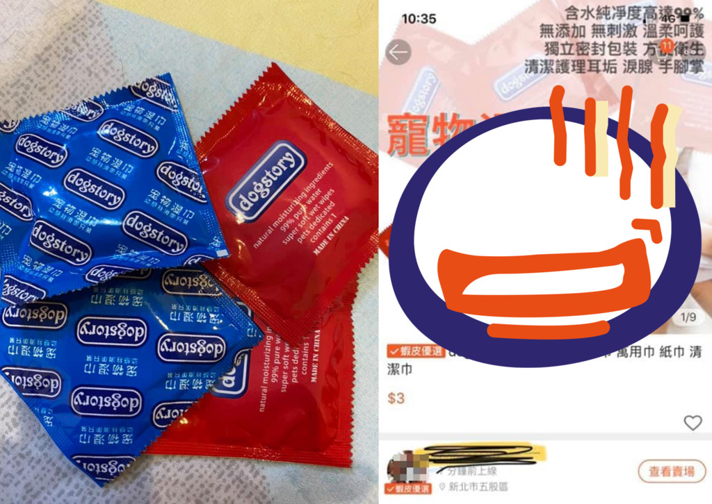 原PO在臉書社團「爆怨公社」表示,她在網路上買了幾個小包裝的寵物濕巾,主打無添加、無刺激,而且每一張都「獨立密封包裝,方便衛生」,不過,造型卻讓人越看越熟悉,尤其是它紅藍的搶眼配色與正方型小巧外型,跟知名大廠保險套有9成相似度,只差在上頭寫的標語不同。