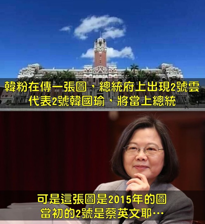 每逢總統大選,候選人完成號次抽籤後,各候選人都會依照號次想有創意的口號;而韓國瑜的粉絲,近日在網路上流傳一張「總統府上空2號雲」,認為這是他當選的徵兆。