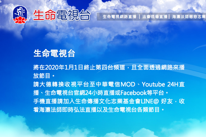 ▲海濤法師《生命電視台》宣布2020年1月1日起終止有線電視頻道播出(圖/翻攝生命電視台官網)