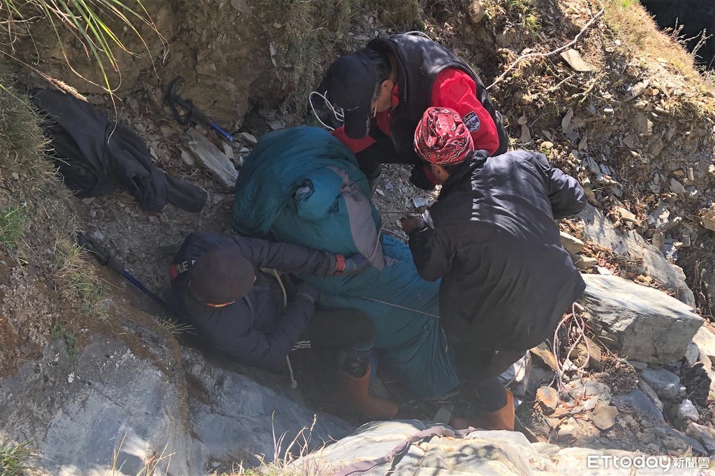 ▲山友跟登山隊爬南二段,在杜鵑營地附近墜谷身亡 ,搜救的義消準備將他背負上山。(圖/記者李忠憲翻攝)