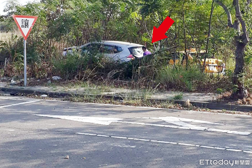 ▲計程車與銀色自小客車發生碰撞後雙雙飛入草叢,有民眾當時拍下肇事者廖健廷(紫衣)下車畫面傳給家屬。(圖/記者蔡佩旻翻攝)