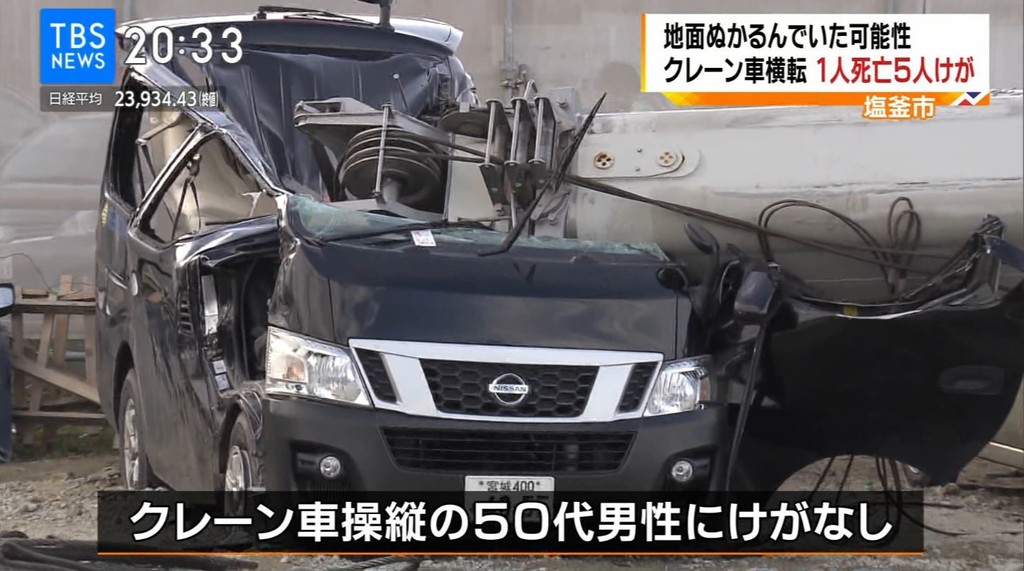 綜合日媒報導,18日上午7時40分,鹽竈市新濱町的警方接獲報案,一處施工現場發生意外,大型起重機翻倒在數輛車上,但車上還有數名工人。等到警方趕到現場時,41歲的三浦隆之已經不幸身亡,另外6名20至40多歲的男性工人則送醫急救,所幸並無生命危險。