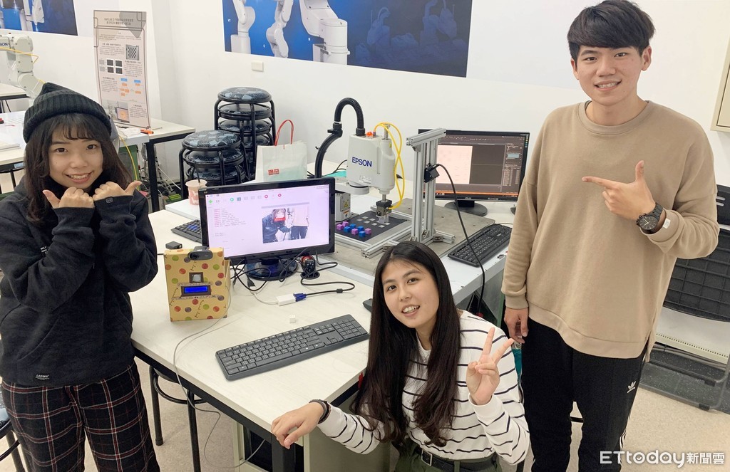 ▲台科大機械系學生(左起)戴昕楷、周庚緯、高瑋澤設計搭載相機鏡頭的機械手臂,讓機械手臂動作更精準。(圖/台灣科技大學提供)