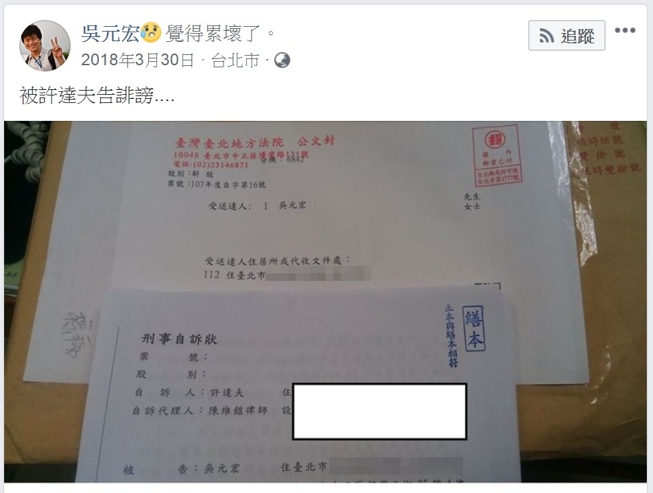 吳醫師辯稱,他是查詢完許達夫的診所官網、臉書貼文、出版書籍等資訊後,才陸續PO病患經歷,及針對許達夫勸癌症病人不要西醫手術、化療,建議另類療法,並推銷、中介病患買不具療效的產品,還從中收取轉介金等不正當行為遭醫懲會處罰等情況加以評論,目的在善意警惕癌症病患,並無惡意虛構事實。