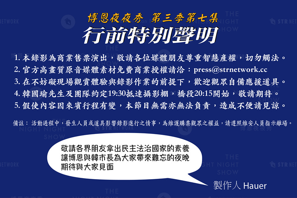 韓國瑜在結束下午挺韓遊行後,將北上出席「博恩夜夜秀」的錄影。薩泰爾娛樂在臉書粉絲專夜發出5點「行前特別聲明」,背景則使用藍色,內容包括,第一,本錄影為商業售票演出,敬請各位媒體朋友尊重智慧產權,切勿觸法。第二,官方高畫質原音媒體素材免費商業授權請洽:press@strnetwork.cc。