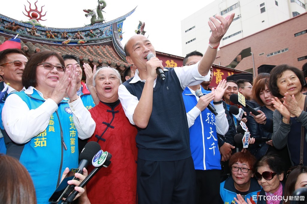 國民黨總統候選人韓國瑜22日上午到霞海城隍廟參香,結束後替立委候選人孫大千輔選、掃街。廟方管理人致詞時對韓國瑜喊「I love you!」並說愛情產業鍊要跟城隍妙合作。