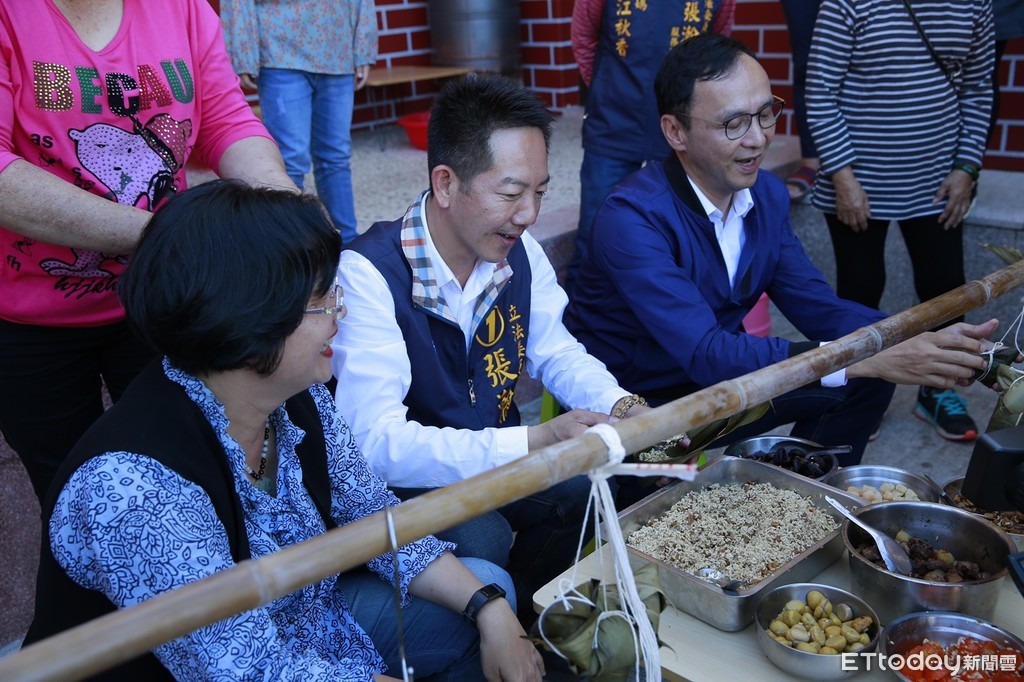 ▲朱立倫赴彰化與婆婆媽媽們一起包粽、搓湯圓為張瀚天打氣。(圖/記者唐詠絮翻攝)