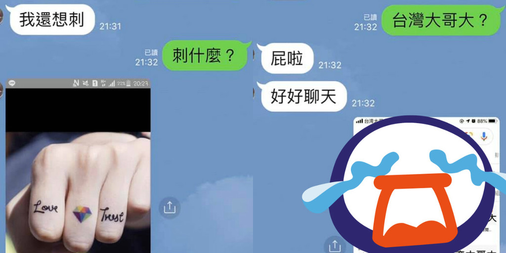 一名男網友在臉書《爆廢公社二館》笑虧,最近友人傳訊「我想刺青」,直言想再次一個鑽石的圖案。結果原PO一看照片秒噴笑,反問「台X大哥大?」