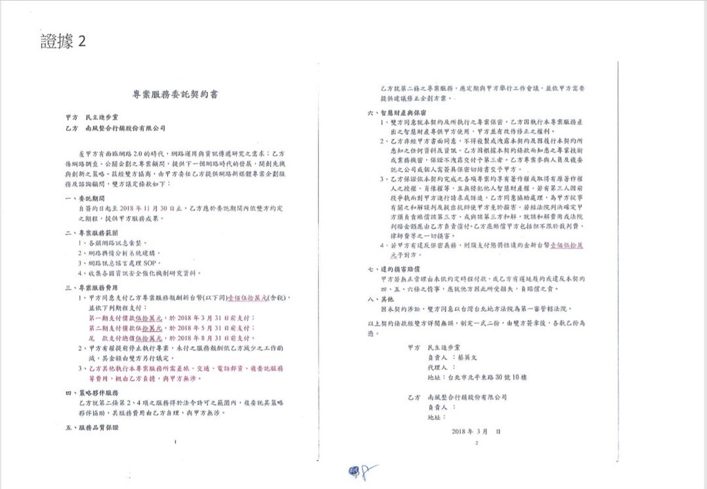 甲方(民進黨)面臨網路2.0時代,網路運用與資訊傳遞研究之需求;乙方(南風整合行銷)係網路調查、公關企劃之專案顧問,提供下一個網路時代的發展,開創先機與創新之策略。茲經雙方協商,由甲方委任乙方提供網路新媒體專案企劃服務及諮詢顧問,雙方議定條款。在專案服務範圍部分,包括一、各類網路訊息彙整;二、網路輿情分析系統建構;三、網路訊息謠言處理SOP;四、收集各國資訊安全強化機制研究資料。
