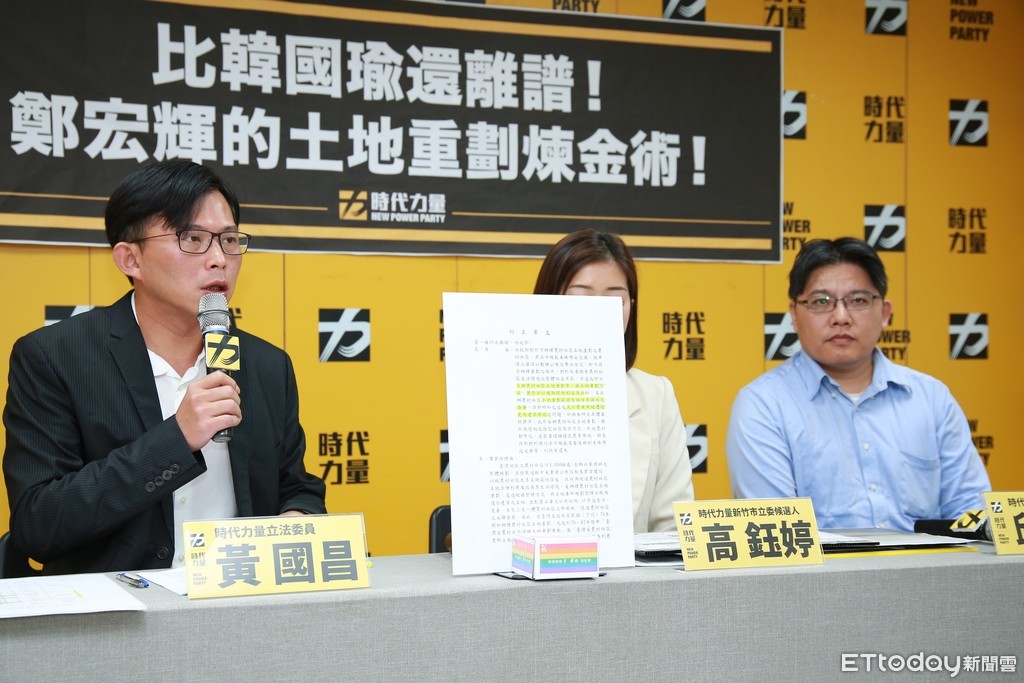 ▲高鈺婷、黃國昌、邱顯智24日召開「比韓國瑜還離譜,鄭宏輝的土地重劃煉金術」記者會。(圖/記者周宸亘攝)