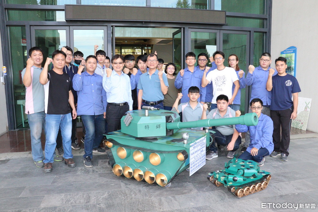 特銲班職訓師劉文賢說,製作過程從冷作、裁切、銲接、研磨、噴漆,全班通力合作耗時三週完成,用到電銲、CO2、氬銲等各種銲接技術,成品不僅砲塔可以360度旋轉,砲管也可以上下移動,非常酷炫,最後由汽車塗裝職訓師林裕強指導學員在車身彩繪軍事專有的迷彩風,也讓整台坦克車更顯帥氣。