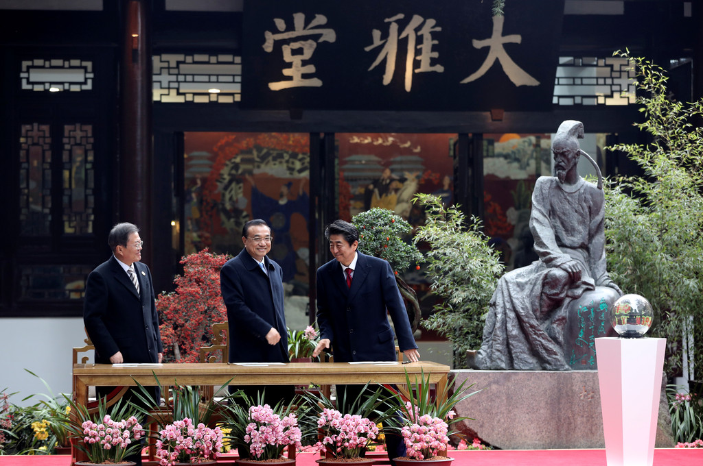 ▲中國國務院總理李克強、南韓總統文在寅、日本首相安倍晉三在第8屆中日韓峰會期間出席活動。(圖/路透)