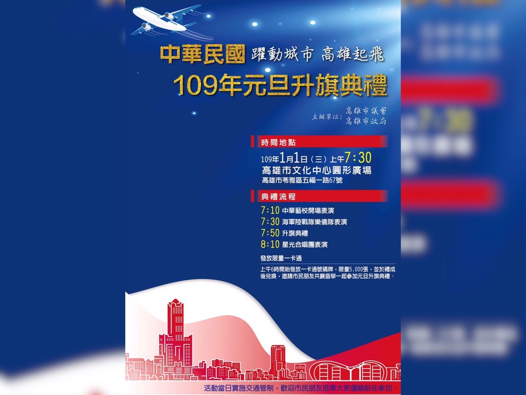 高雄市2020年元旦升旗活動將選在高市文化中中心舉行,主題以「躍動城市 高雄起飛」為主題,當天除照慣例有海軍陸戰隊樂儀隊等團體演出外,也將免費發放元旦升旗「一卡通」限量5000張,2020年的一卡通以國旗配色紅藍白為設計,想必又會造成一股民眾搶排風潮。