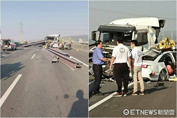 ▲黃男雇用無照東男駕駛吊照的聯結車超載鋼樑撞護欄輾過林男駕駛的自小客車,1家3口亡。(圖/和美消防分隊提供)