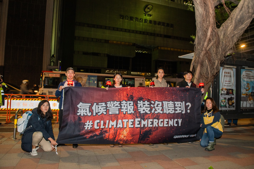 2020總統候選人電視政見發表會最後一場27日舉行,綠色和平組織守在場地外,拉起「氣候警報」的布條,手持氣候警示燈,要求候選人盡快提出因應氣候變遷的政見。