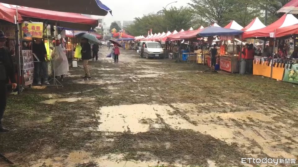 有民眾因為路面太濕滑乾脆脫鞋,打赤腳踏著一整片泥水。主辦單位為防止有人滑倒,緊急出動大面積防水墊鋪設在地面上,避免泥濘造成意外發生,目前台中正下著傾盆大雨,若有到場參加活動的民眾,步行時務必注意自身安全。