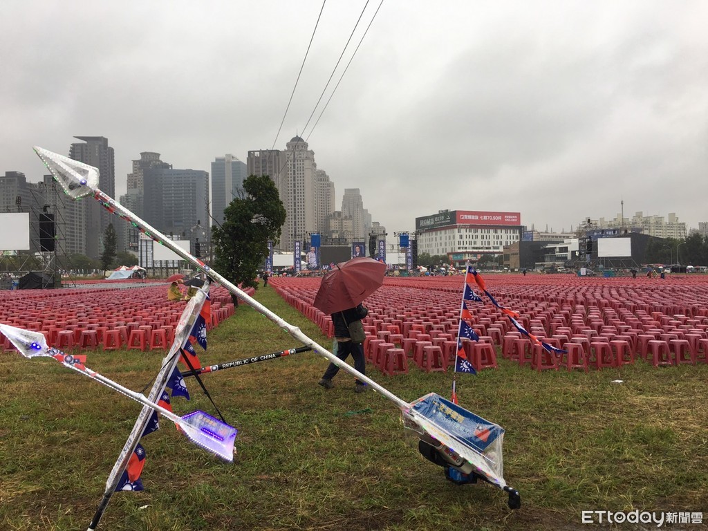 國民黨總統候選人韓國瑜29日在台中市市政路、黎明路空地舉辦「國政領航、台灣富強」造勢晚會,但天空不作美,一大早就是濕冷天氣,地面泥濘不堪,不但國瑜夜市生意慘淡,號稱擺有10萬張椅子的民眾區也是零零落落,不過,實際計算,頂多擺4萬張,至於下午實際出席人數,考驗韓粉的忠誠度。