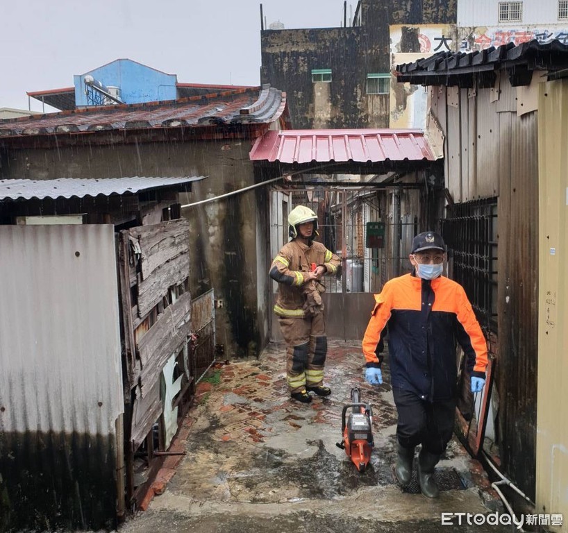 ▲台南市學甲區成功路一處民宅,傳出屋頂崩落有人員受困事件,消防局將女外籍看護及80多歲阿嬤送醫檢查。(圖/記者林悅翻攝,下同)