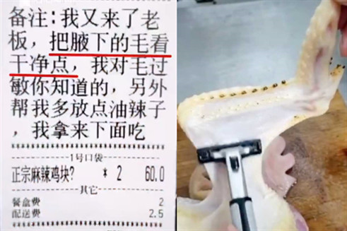 據《看看新聞》報導,重慶一家餐廳連續幾天接到同一名顧客的訂單,收到的餐點分別是「正宗麻辣雞塊」和「招牌紅油豬耳」。顧客在訂單上還備註,「老闆一定要把毛看乾淨點,我對毛過敏,另外多打一點米飯,一天沒吃飯,餓得不行了,祝生意興隆」、「我又來了老闆,把雞腋下的毛除乾淨點,我對毛過敏你知道的,另外幫我多放點辣椒油,我拿來煮麵吃」。