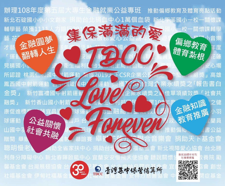 集保結算所成立30週年,在長期開展多元業務與深耕金融服務下,營運成績斐然,獲獎不斷,深獲各界肯定,除專注本業,也長期關懷社會,主辦「大專生金融就業專班」培力金融與體育人才、連續10年舉辦愛心捐血活動、舉辦「花蓮九校聯合音樂會」及「集保盃第二屆射箭聯誼賽」等,也捐助教育部教育儲蓄戶、金融總會金融教育獎助學金、偏鄉學校圖書公益贈閱,拉近城鄉教育落差。