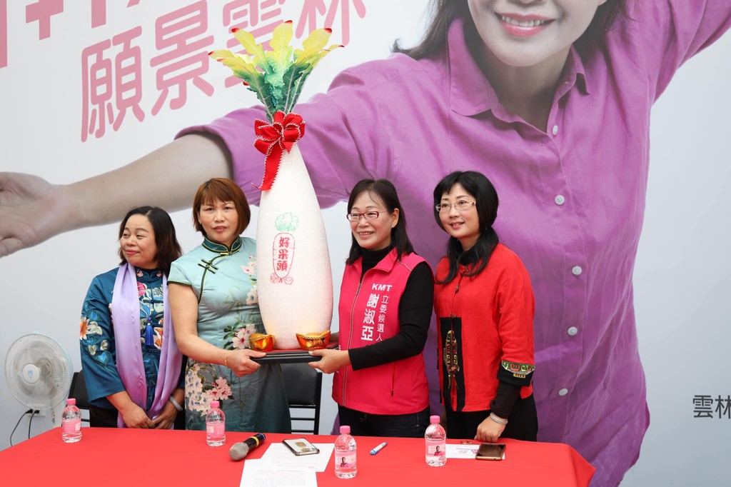 雲林縣新住民同心關懷協會理事長的張鳳元、副理事長鄭晶晶、雲林縣新住民姊妹協會裡面多名姐妹30日前往謝淑亞競選總部,以「我們都是雲林媳婦,雲林就是我們的家」為標語力挺謝淑亞,還致贈好采頭預祝謝淑亞高票當選。