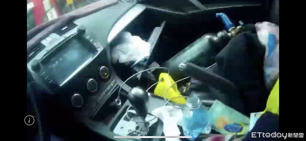 ▲桃園市張姓女子30日下午開車在桃園區肇事撞車,員在副駕駛座上查出有笑氣鋼瓶與氣球。(圖/記者沈繼昌翻攝)