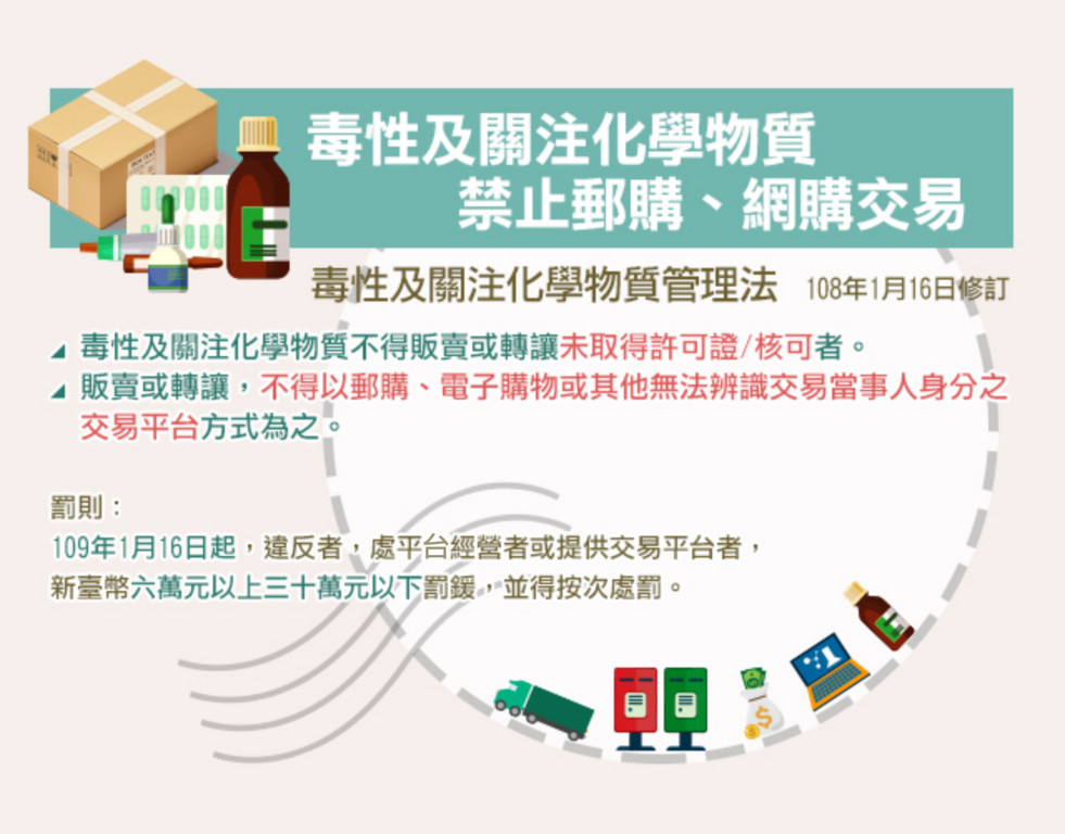 環署表示,總統修正公布「毒性化學物質管理法」,名稱修正為「毒性及關注化學物質管理法」,明訂毒性及關注化學物質不可以透過郵購、電子購物或其他無法辨識交易當事人身分的方式進行販售,並新增提供交易平台的經營者相關罰則,透過法規修正強化管理效果。依據前述法規規定,除違規販售與使用者有相對應的罰則外,今年1月16日起處違法之平台經營者或提供交易平台者,新台幣6萬元以上30萬元以下罰鍰,並得按次處罰。