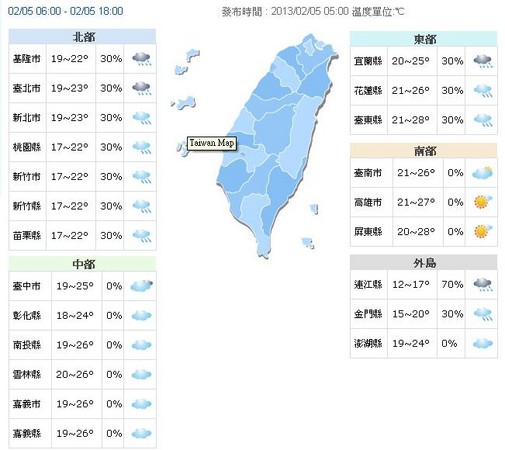 另外,中央氣象局也提醒,5日金門、馬祖地區有短暫雨,下午起鋒面影響,北部、東半部地區及中部山區將轉為有局部短暫雨的天氣,其他地區及澎湖雲量增多。
